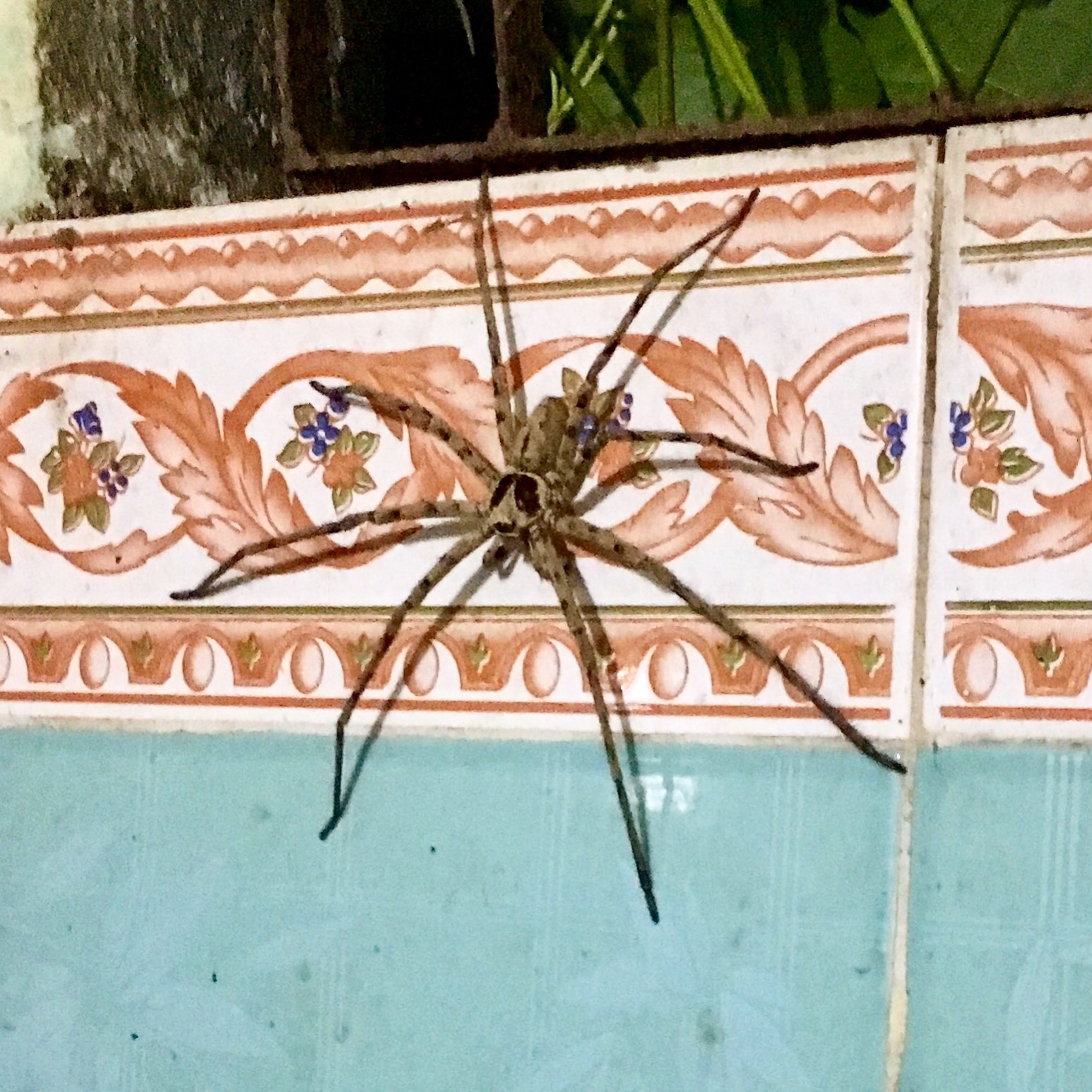 The soapless bathroom is a series of very dirty and smelly squat toilets. There’s a big deep hole in the middle of the floor. There are about 10 tiny urinals in a row, each about a foot apart. This spider waits above a middle one and measures 6″ across. I’m trying to pee in the first urinal, with one eye on this spider. I don’t know what it’s capable of.